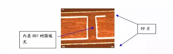 使用樹脂將內層HDI的埋孔塞住,然后在進行壓合。這種工藝平衡了壓合的介質層厚度控制與內層HDI埋孔填膠設計之間的矛盾。